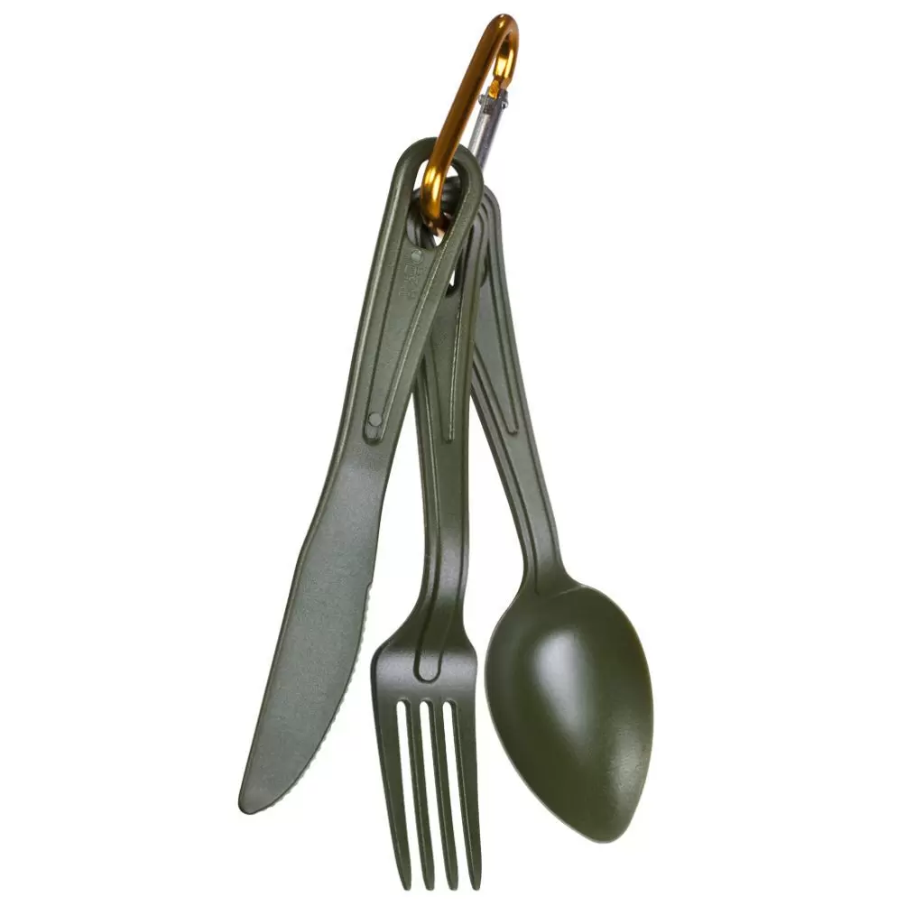 Composto por garfo, faca e colher, são todos feitos de policarbonato, um material super resistente e leve! Em suas extremidades, os itens possuem uma alça na qual é possível prender um mosquetão para evitar que eles se separem ou se percam quando não estiverem sendo usados.