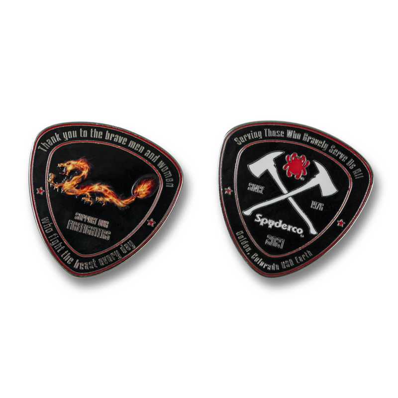 Criada para homenagear a bravura e o serviço dos bombeiros dos EUA, esta moeda personalizada diz: “Obrigado aos bravos homens e mulheres que lutam contra a fera todos os dias” e “Apoie nossos bombeiros”. Com acabamento brilhante em níquel e meticulosamente preenchida com esmalte, esta moeda impressionante também ostenta o logotipo da Spyderco e o ano "2021".