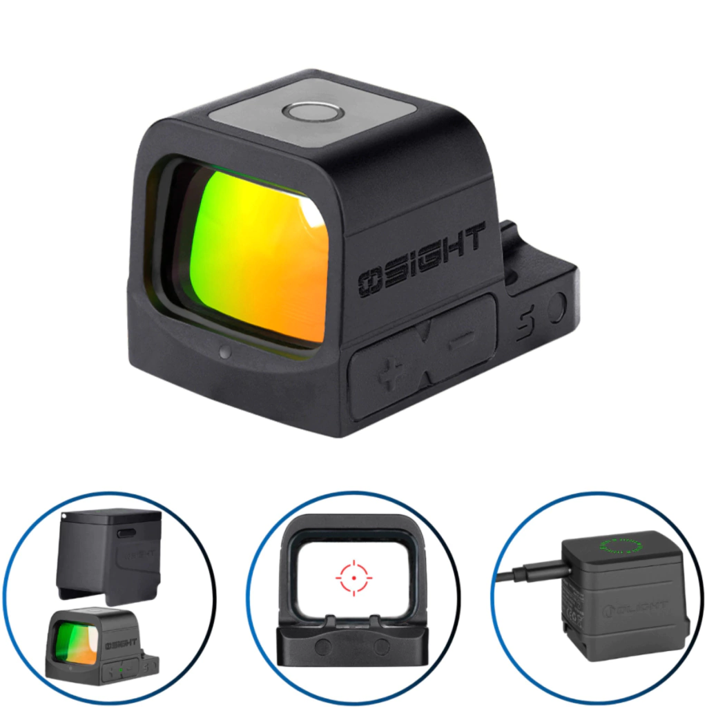 - O red dot Olight Osight S é a maior revolução do mercado. Ele possui bateria interna com carregamento magnético por uma case de carregamento exclusiva, possibilitando até 87.600 horas de duração.