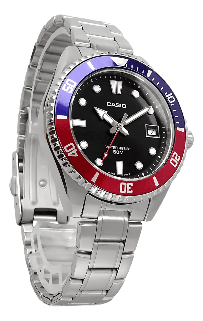 Relógio Casio Standart Collect-MDV-10D-1A3VDF-SC Descrição do produto: Saia e aventure-se com uma versão menor e mais compacta do sempre popular design MDV-107. Esse relógio esportivo adiciona uma moldura rotativa unidirecional ao design de clássico dos ponteiros de horas, minutos e segundos. Mecanismo:Digital Máquina:Quartz (Movido a Bateria) Material da caixa:Aço Inoxidável Vidro:Vidro Mineral Cor da Caixa:Prata Cor do mostrador:Preto Largura da caixa:42 mm Espessura:10,4 mm Material da pulseira: Aço Inoxidável Cor da pulseira:Prata Comprimento da Pulseira:150mm a 205mm Fecho:Fecho de 3 dobras Peso:85 gramas (Aprox) Função:Calendário (dia do mês) , Aro unilateral ( anti inversão) Alarme:Não
